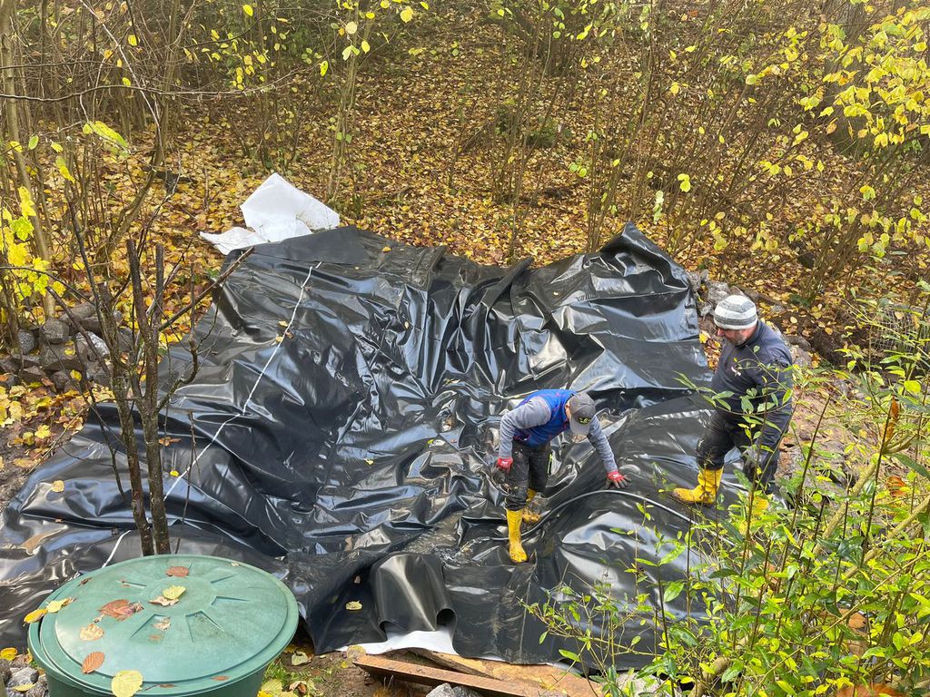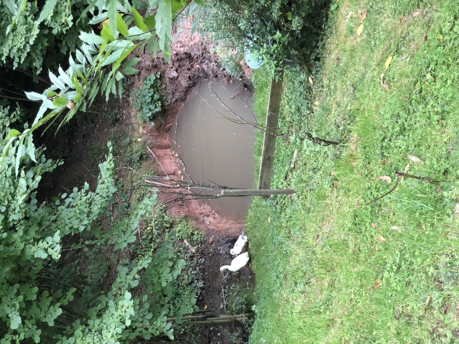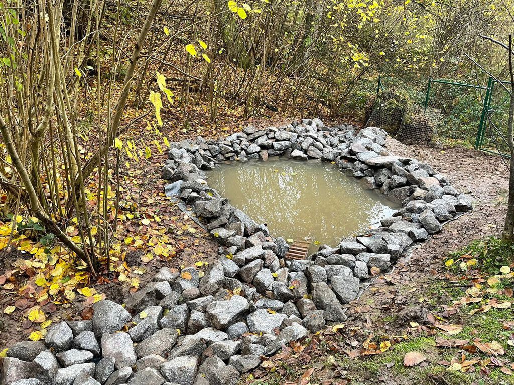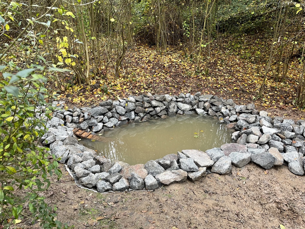 An einem Punkt hat sich immer eine Pfütze gebildet, weshalb wir die Idee hatten dort eine Vertiefung zu schaffen und einen kleinen Teich zu schaffen.